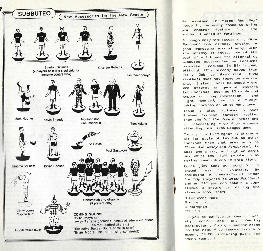 There is more but that’s for another day, it’s easy to see why this fanzine was well respected, it is superbly balanced and its contents hold up very well against the cruel mistress of time. It received the following review from Sunderland classic Wise Men Say. We’ll return to this and the absolutely, totally brilliant Blow Football Subbuteo new accessories cartoon in our blog this week.
