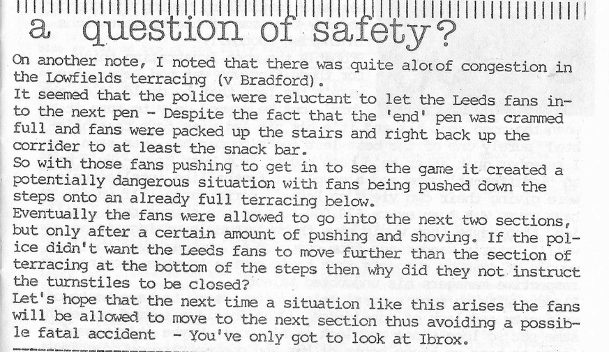 This zine was published in April 1989 with the editorial containing this absolutely horrifying description of a crush and a totally inadequate police response at Elland Road on March 1st. Just 6 weeks before the Hillsborough disaster it references the previous deadly crush at a Ibrox in 1971. The police clearly hadn’t learnt a thing in 18 years and sadly they wouldn’t for years to come.