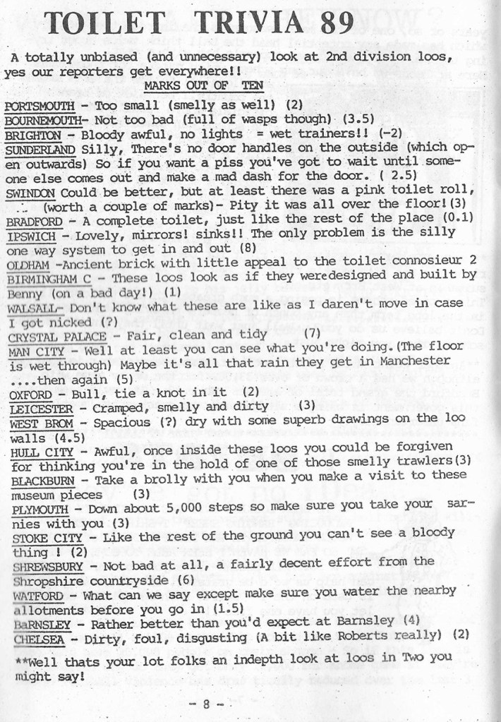 A review of the 2nd division toilets visited that year helps paint an even more colourful image of what being a fan was like. Mirrors and sinks at Ipswich and pink toilet roll at Swindon? Bloody hell.