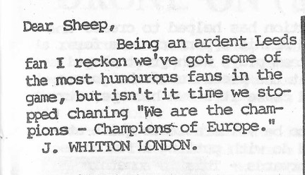 Today’s #FOTD is issue 5 of long running Leeds fanzine The Hanging Sheep and comes with an ulterior motive. First though, let’s have a look through the excellent contents of this 40p belter from April 1989. The cover has the fantastic Hanging Sheep logo, the first time this logo appeared and one that would remain in place for every later edition. There is also news of this being a bumper edition and a simple but effective joke about local rivals Bradford’s hopefully imminent return to the lower depths (They would actually finish 14th, just 4 places below Leeds)