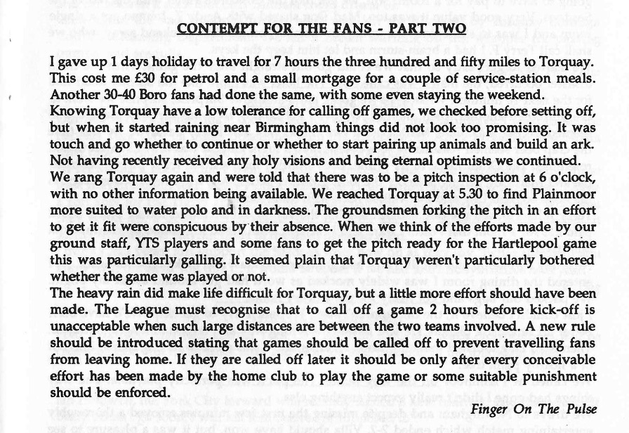 There is news of a days holiday take and a 7 hour, 350 mile journey to Torquay for an evening KO cancelled at…6pm. These were the days when pitches and late pitch inspections were just another way clubs held fans in contempt.