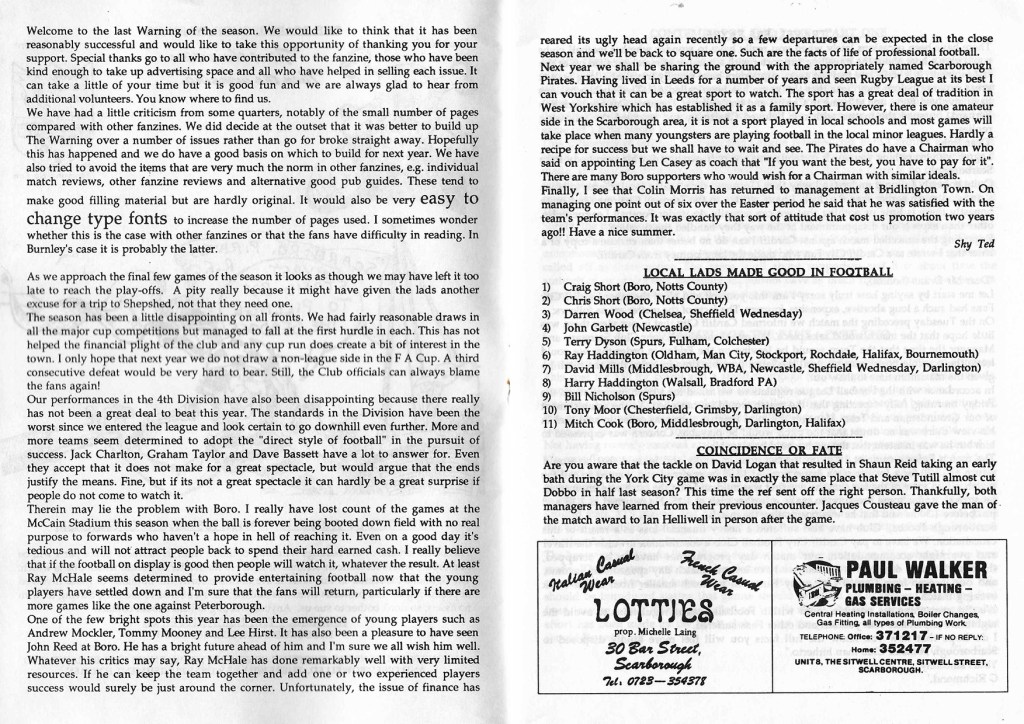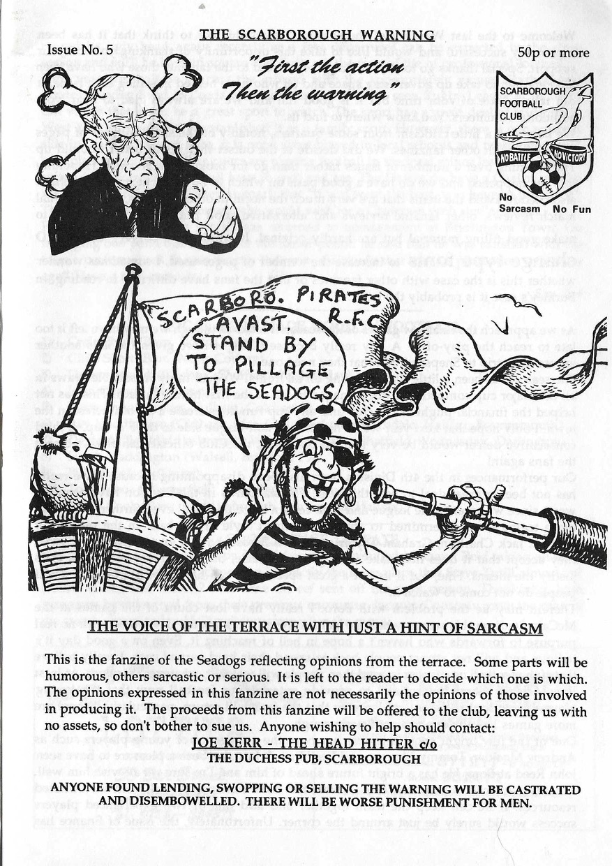 Today’s #FanzineoftheDay comes from the footballing outpost that was Scarborough FC, issue 5 of The Scarborough Warning appeared in May 1991 (we think, there is no date anywhere). The mighty fine cover mimics the club crest with a much better moto and reveals the fanzine address as being The Duchess Pub. Great stuff.