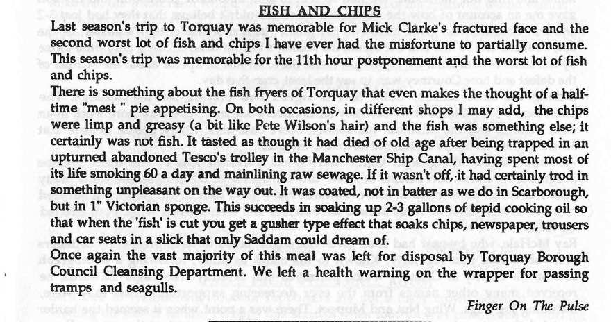 This being a Scarborough fanzine the fish and chips available in a visiting town get the once over and it’s not good. Mick Clarke might argue that his was the worst misfortune but I’m not sure our correspondent would agree having eaten ‘fish’ that had been “mainlining raw sewage”. For more on the fanzine-food nexus you can read last week’s blog here. https://footballfanzineculture.blog/2026/04/02/masterchef-the-fanzines/