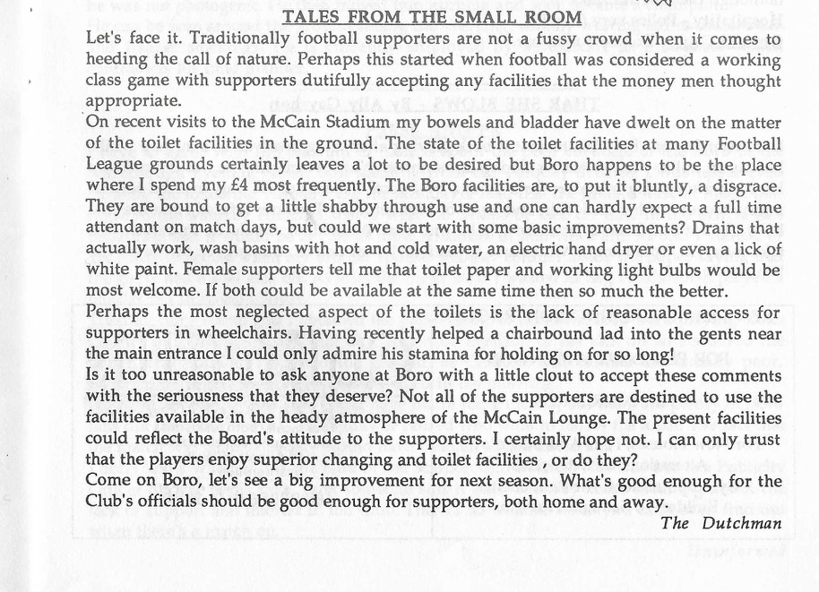 The editorial goes long on a disappointing season. Tbh it was about the best the club would achieve in their 12 year league sojourn, finishing just outside the playoffs in 9th and of course all boro fans would snap your hand off to be back there nowadays. The editorial dows give a good explanation of the different ways fanzines approached their task however and 24 pages of tight engaging text like this suggest some of the buyers didn’t really know what they were talking about. The arrival of RL the next season didn’t do much for the club finances.