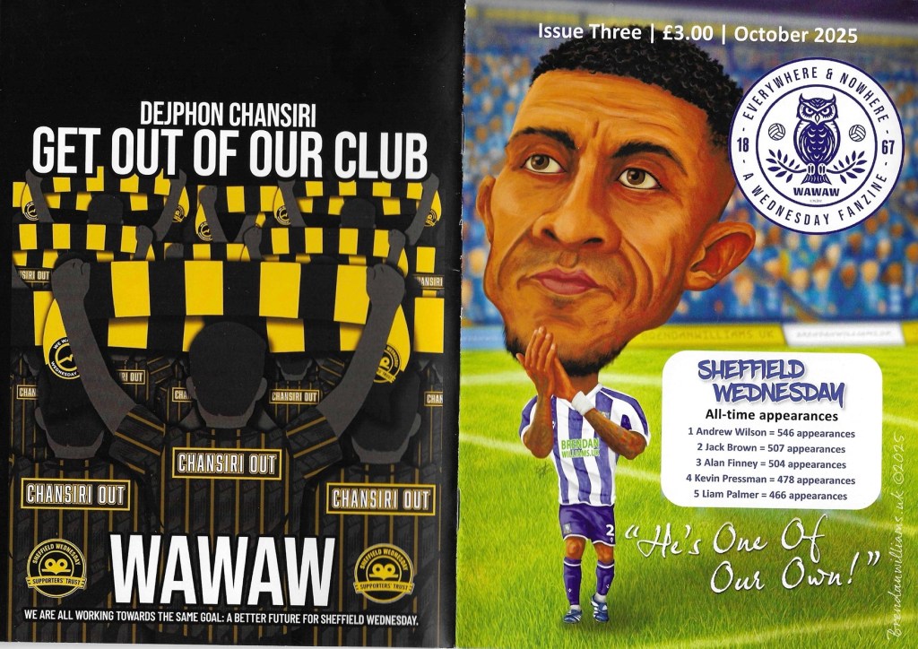 I’d already got lots of ideas for articles & features in my own head that I wanted to publish and I knew that I’d get absolutely zero assistance from the club – that didn’t bother me that much to be honest because the Wednesday Supporters Trust had already started their ‘Not a Pound in the Ground’ campaign and the fans got well & truly behind it. The fans bought little to no food & beverage on the concourse, no programmes, we had two very successful match boycotts – one of which was the live TV Sky game vs Middlesbrough. So with those factors in mind the launch of Everywhere & Nowhere had a head start and a good platform to work from. However when I launched the fanzine I promised the readership that it would be full of positivity and there’d be no mention of the former Chairman. In the circumstances that was always going to be a tough ask – but it’s been achieved and the fans acknowledge that in their articles and through buying and subscribing to the fanzine.