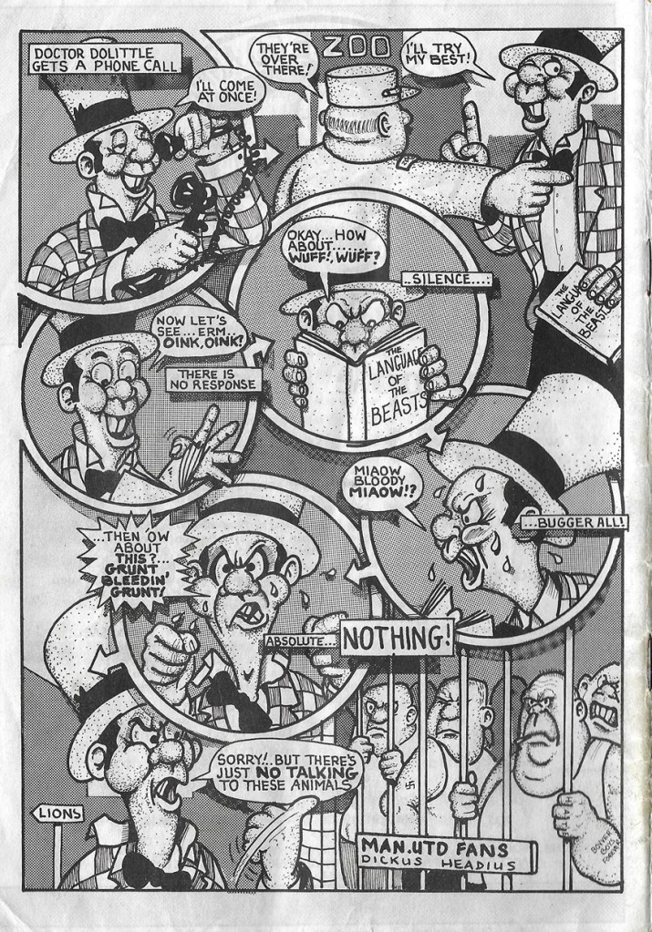 The pages inside are packed and all for £1 but before we even get to that behold the superbly drawn and executed Dr Doolitle cartoon on the back cover taking the mickey out of friends and neighbours at Old Trafford. Lovely stuff.