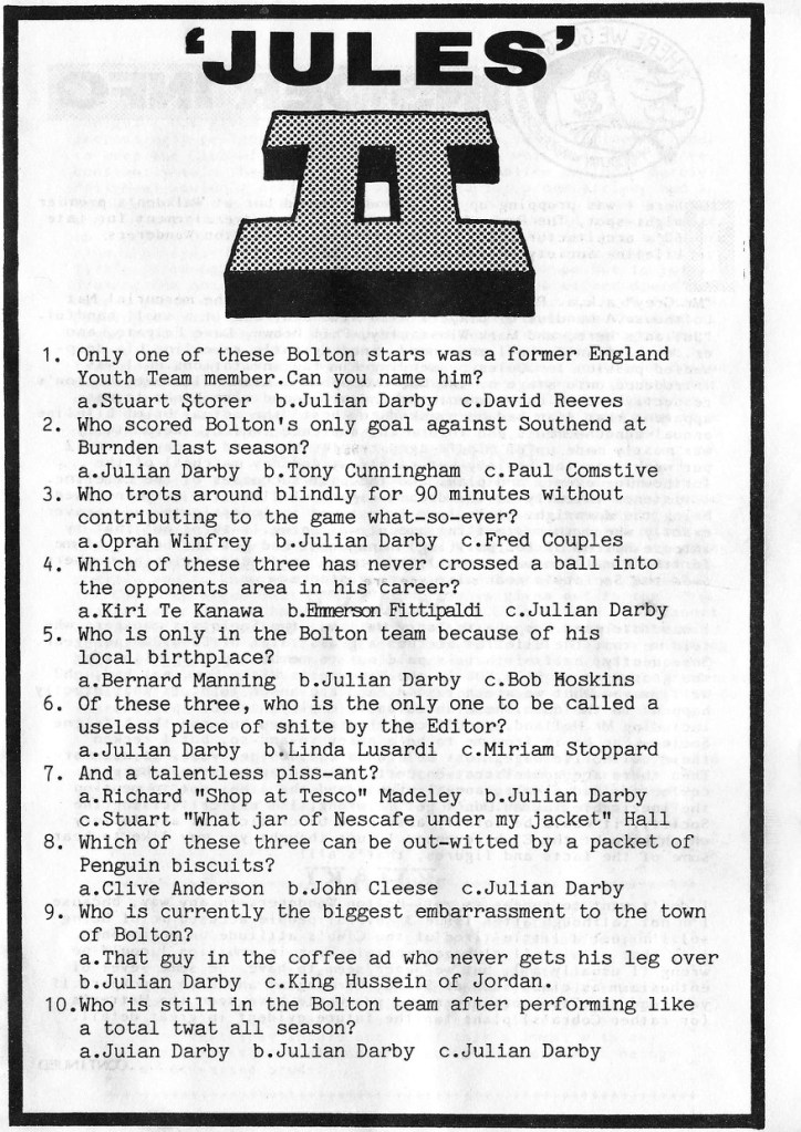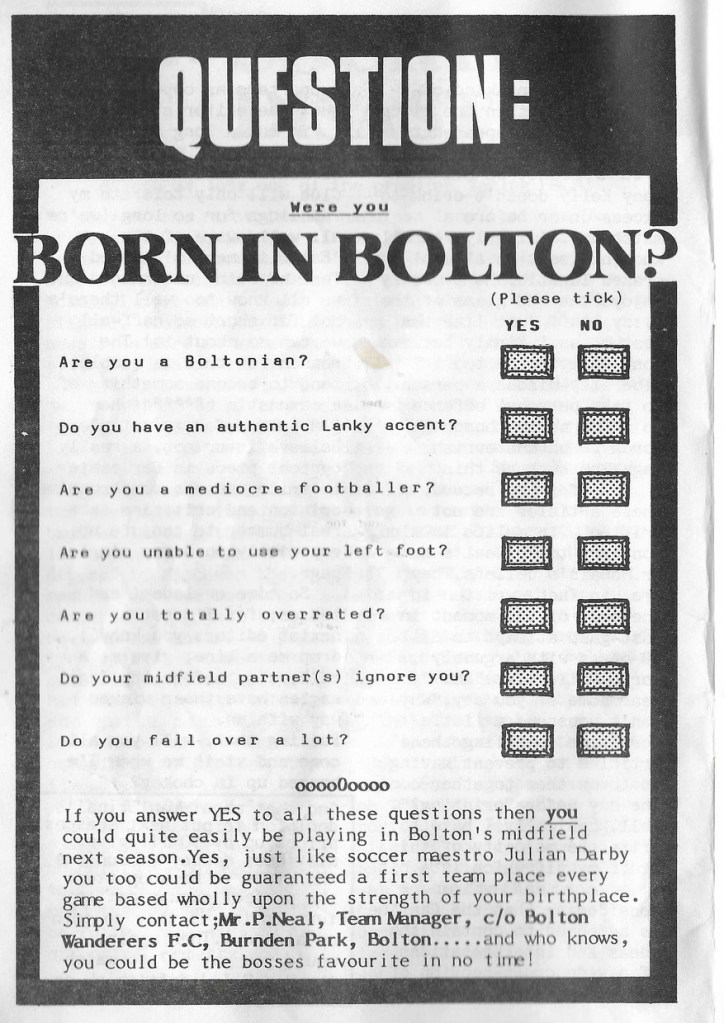 The warning to the Julian Dary fan club quickly becomes a little bit more with a poll on whether or not you could play in Bolton’s midfield. Darby scored 36 goals for the Wanderers in 270 appearances. The fact that he scored in the 1989 Associate Members Cup final, where Bolton beat Torquay 4–1 at Wembley holds no water with our correspondents.