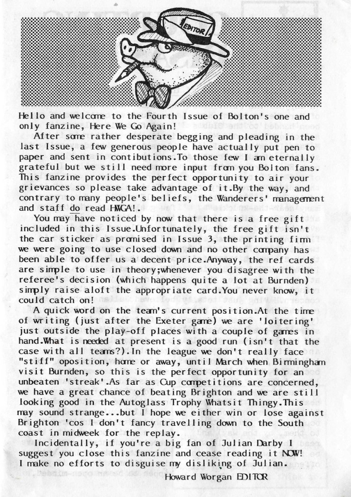 The editorial is standard but well written fare, a plea for contributions has worked, a claim that the club do read the views within, a scaled back gift, the call for a good run from the team even if that includes a loss at home to Brighton. Finally there is a warning to the Julian Darby fan club, great editor pic.