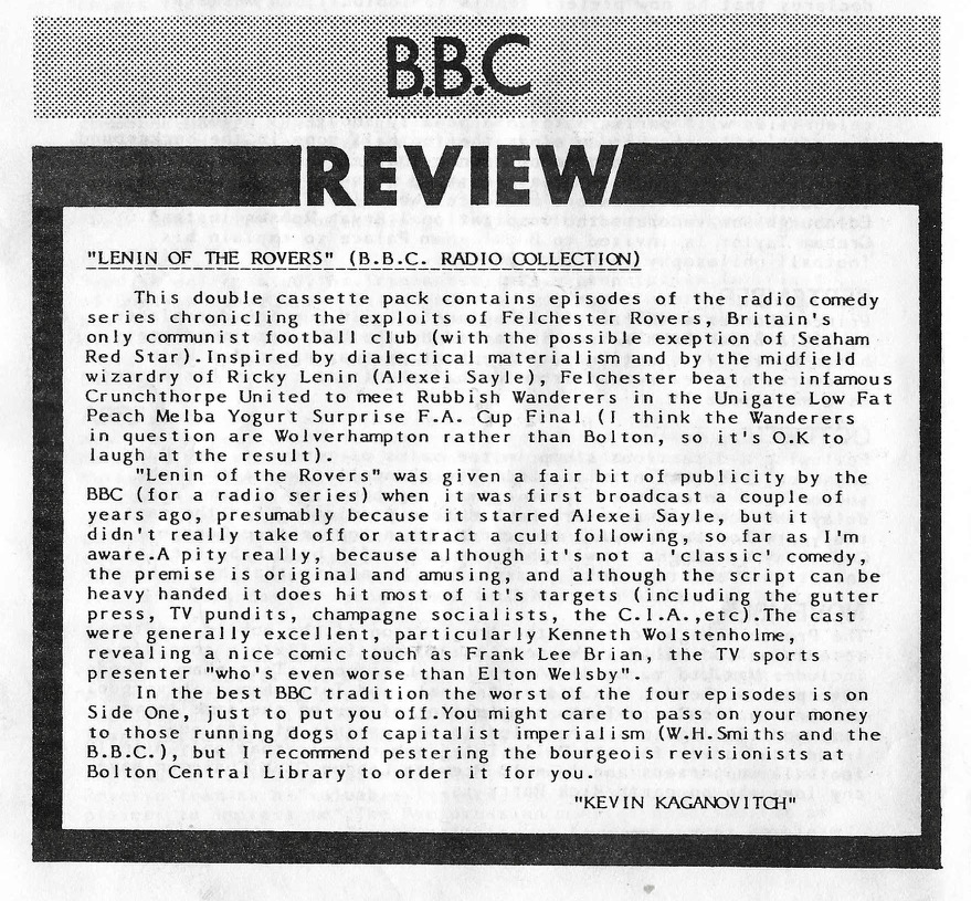 There is something of an oddity for a fanzine which shows its age; a review of the cassette version of a radio show. I must admit that I had forgotten about ‘Lenin’ but do remember it being pretty good at the time. I know I’m showing my age by admitting to listening to radio shows but there you go. I did a bit of digging and a cast including Alexei Sayle, Phil Cornwell, John Sessions, Keith Allen, Jim Broadbent and the legendary Kenneth Wolstenholme can’t have been all bad. This WSC review certainly agrees with HWGA recommending a trip down to Bolton Central Library. https://www.wsc.co.uk/the-archive/radio-revolution/
