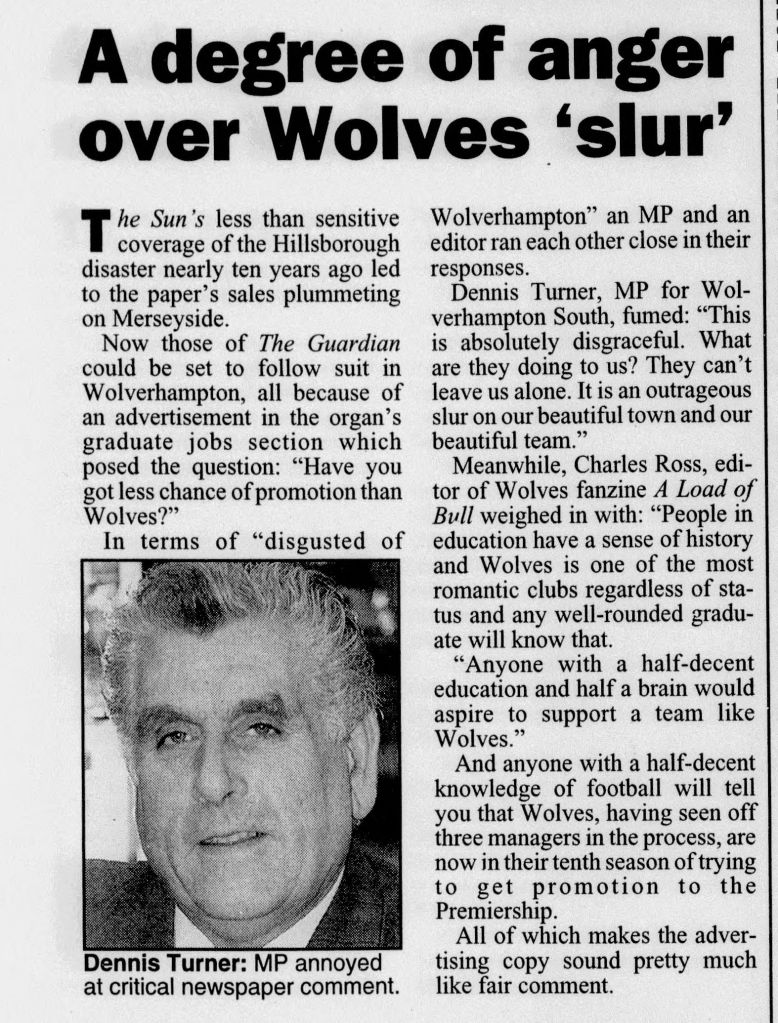 Though I’m sure the MP was outraged when The Birmingham Daily Post ran this in 1989 I’m pretty sure the paper and the editor of A Load of Bull were clearly being a little tongue in cheek. The comparisons with the lying shitbags at the Sun were hardly reasonable and the thought of sales of the Grundiad (sic) falling in Wolverhampton begs the question ‘how much further?’ The terraces at Molineux were never really tree hugging, sandal wearing territory now were they. You also can’t help feeling that just about every other club’s supporter in the West Midlands and let’s be honest, much further beyond would have found this highly amusing.