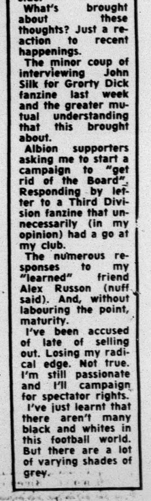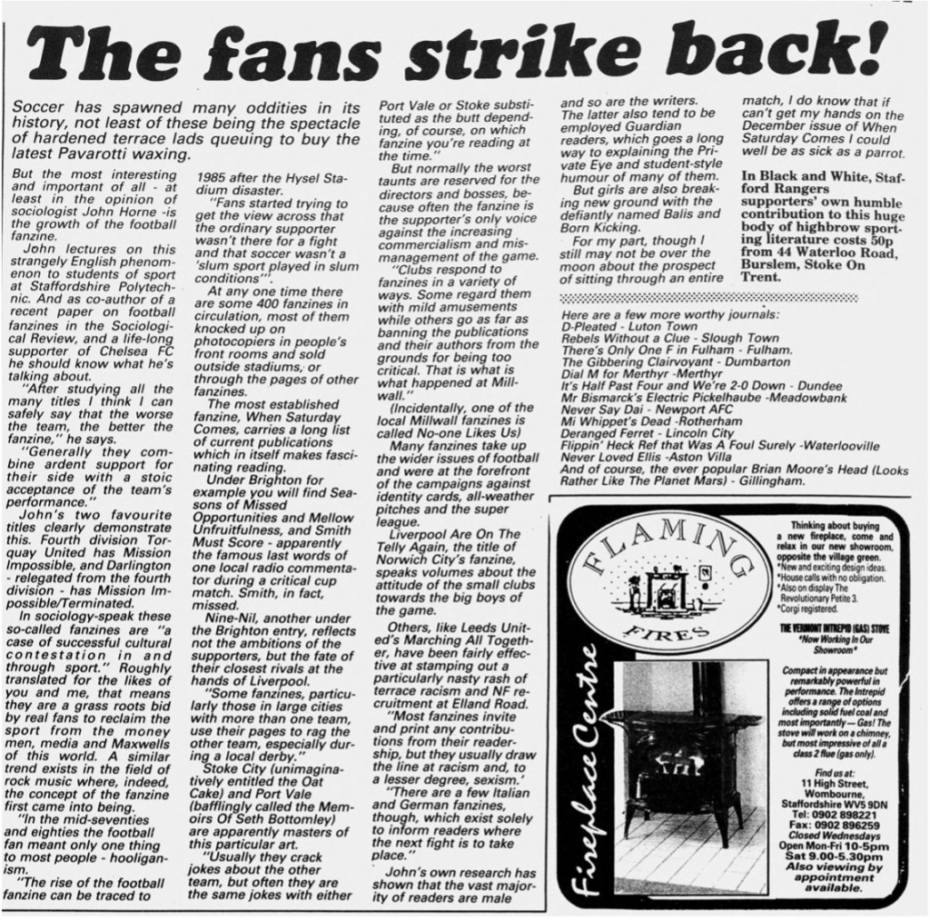 One fanzine editor was even asked to write a column for the world famous, Birmingham based local Saturday sports paper ‘The Sports Argus”. Grorty Dick’s Simon Wright presented this ‘Alternative View’ in February 1992