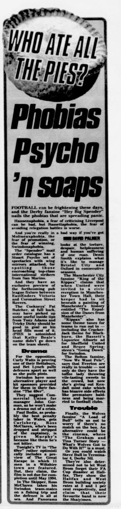 By 1994 The Daily star ran a column entitled “Who Ate All The Pies” covering the frightening world of football…as covered by fanzines. Phobias, Psycho ‘n Soaps’ lists some tremendous sounding pieces in fanzines from some of the classic names. I very much like the suggestions for run out music, from King of The Kippax. Hey Big Spender has some tremendous ideas including an imaginary pub league fixture between Eastenders and Coronation Street and the 69er’s imaginary TV guide takes some beating.