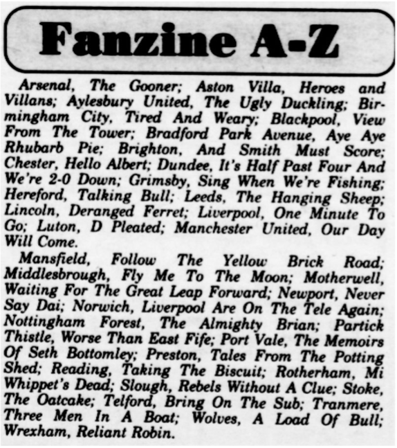 In October 1991 The Shropshire Star ran this A-Z list of football fanzines. Shropshire, 1991 and a list of football fanzines was appearing in the local newspaper…the press was waking up to the competition even if they missed out fanzines from clubs beginning with E, F, I, K, O, Q, U, V, X, Y and Z. To be fair to the Star, if anyone does know of a fanzine for a club beginning in X or Z we’d be happy to hear from you. There were fanzines with names beginning in X and Z, Xmas Something at Matlock Town and Zico Was a Punk Rocker which covered CliftonVille and Shamrock but was more of a general/music zine.
