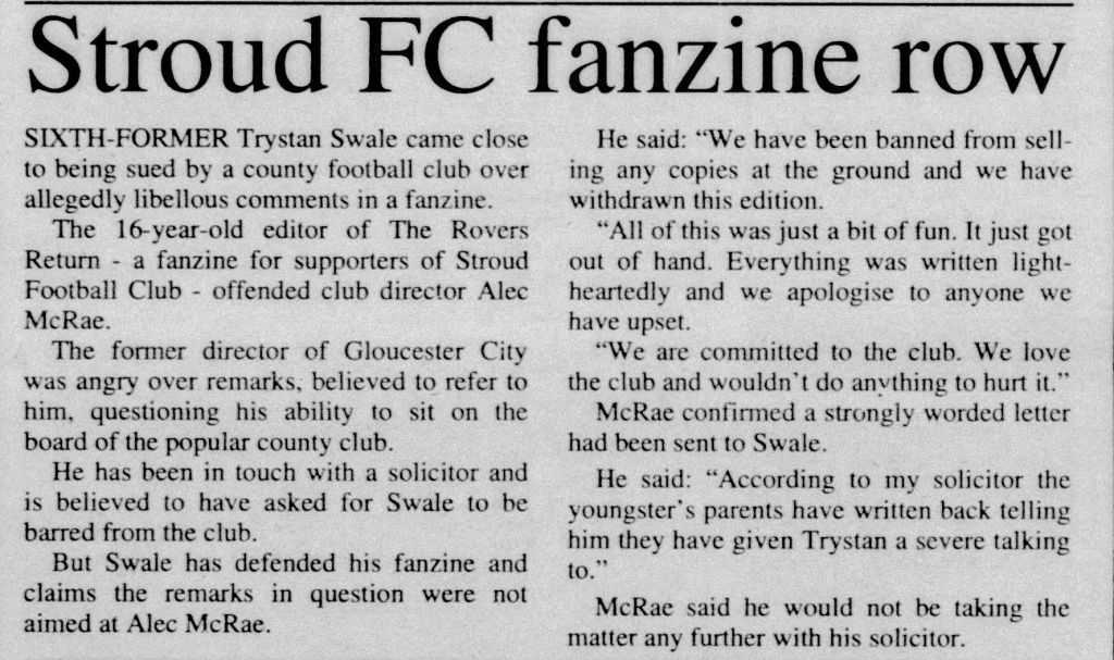 So I’ll end with this magnificent article from the Gloucester Citizen from December 1991. It stars Stroud fanzine Rovers Return, the 16 year old editor, some solicitors and the chairman of Stroud FC plus a severe parental talking to. Absolutely magnificent, if anyone has a copy please let me know.