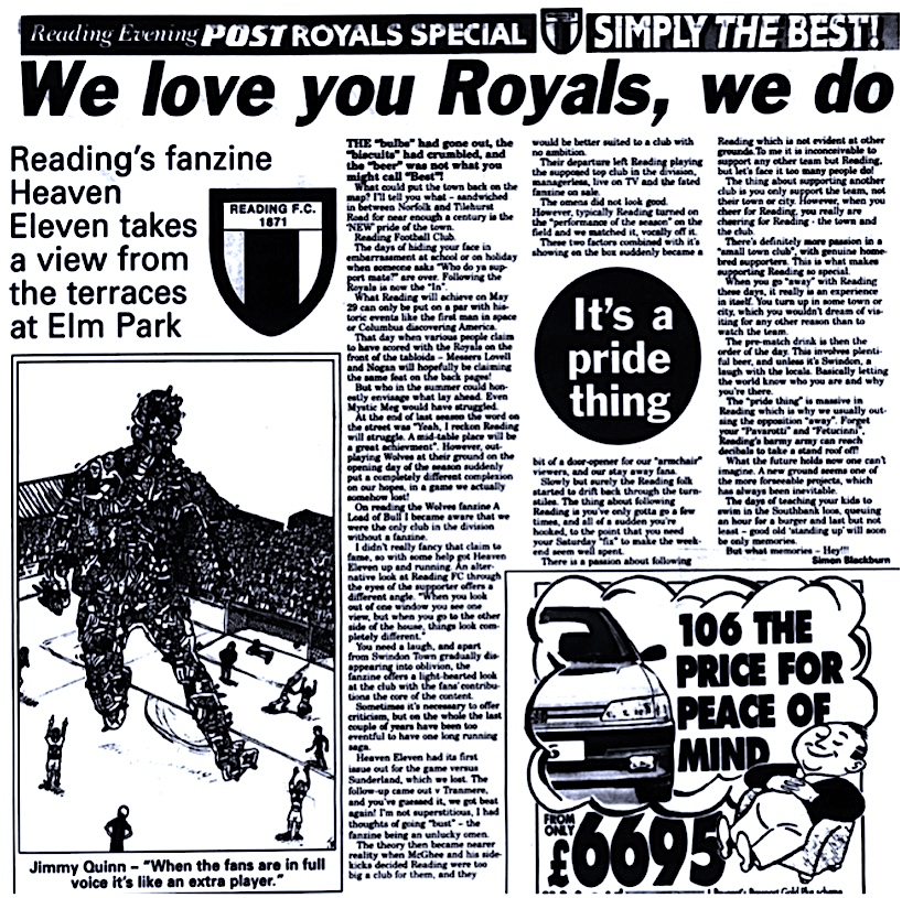 It’s a nice little time capsule on why you’d start a fanzine (because Reading didn’t have one) and football supporting in general. The mock up of the fans as a gigantic 12th man made up of dark matter is a bit startling as is the ad for a Peugeot 106 at the crazy piece of £6,695! (I just looked; a 1993, L Reg 106 with just 889 miles on the clock is available on Autotrader for £8,895 if you want to waste your money on one of the worst cars ever invented)