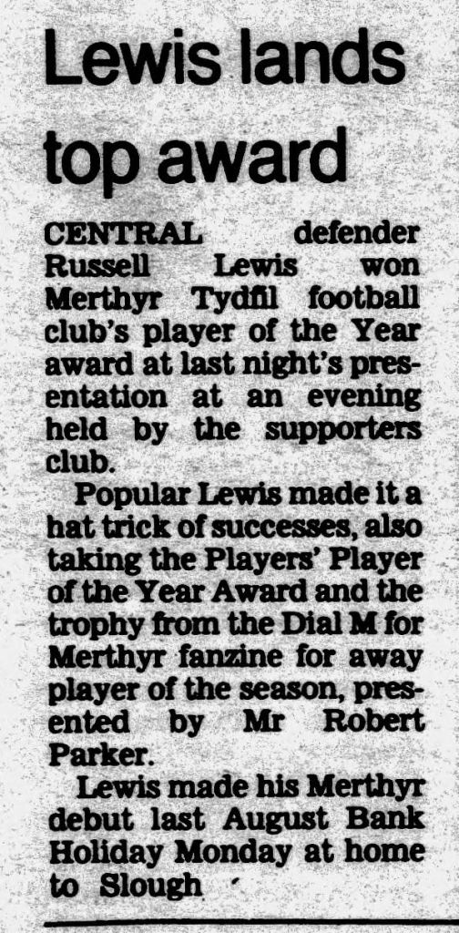 How about this, Dial M for Merthyr’s award for ‘Away Player of the year’ remembered in a June 1991 issue of the South Wales Echo (how many awards did you run lads?)