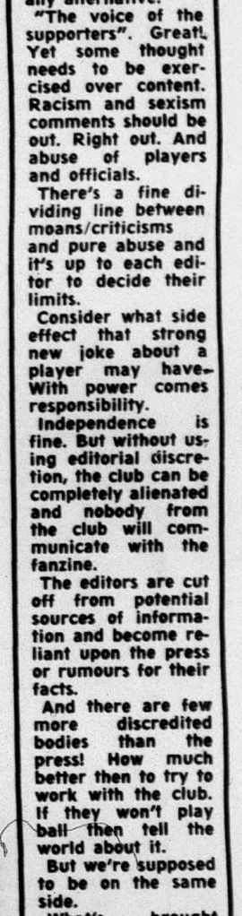 It’s a great piece covering the difference between journalists and fanzine editors, the fact that despite appearances, sometimes there WERE limits on what a fanzine would say or do. The tension of being too close to the club or totally independent of the club (cut off from all contact) is also addressed…shades of grey are invoked well before that became a grubby interjection.