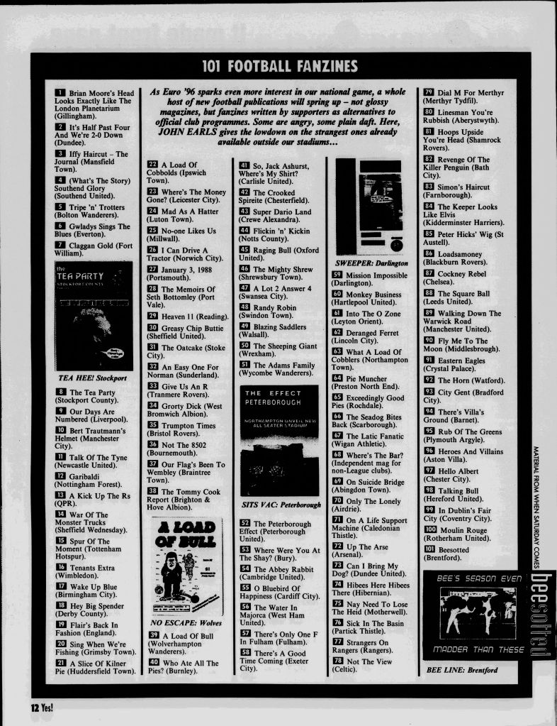In 1996, with Euro fever sweeping the nation even more fanzines were given free publicity from the mainstream press with this list of 101 of the strangest fanzines appearing in The People.